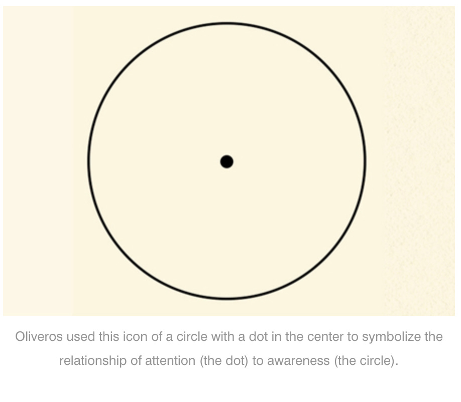 At the core of Deep Listening, lies the relationship between awareness and attention. In an elegant diagram that first appears in her introduction to Sonic Meditations, Pauline Oliveros defined the relationship between attention and awareness as a dot in the middle of a circle. By bringing attention to the sounds in the space/time continuum and directing our awareness and attention, she laid the groundwork for how listening can be a channel for intentional action. In Deep Listening: A Composer’s Sound Practice, she says, “Listening is directing attention to what is heard, gathering meaning, interpreting and deciding on action.”