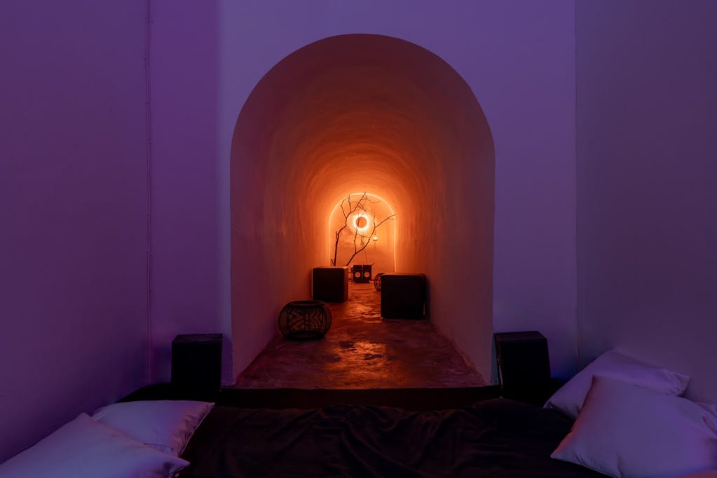 In recent years, there’s been a prevalence of ‘colourful’ noise – white, pink, brown and so on. Countless streaming playlists and meditation apps often promote these sounds as tools for relaxation, offering endless recordings of subtly varying white noise. Technically, white noise contains, in equal parts, all of the audible frequencies distributed across the spectrum. Akin to the effect of balanced symmetry that so pleases the human eye, white noise masks the inconsistencies of a sonic environment. It softens startling noises from the external environment and quietens intrusive thoughts from the internal environment, making the listening experience feel steady and contained.